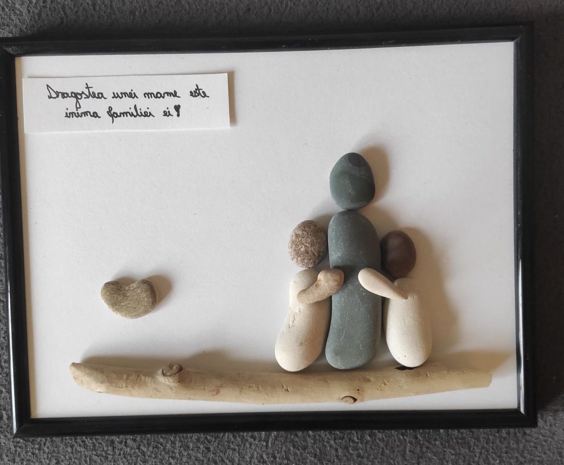 Selma from Constanța, Romania makes ripples with pebbles “dropped” into a frame because she expresses her soul’s beauty while “painting” with those pebbles. She works with them as her soul urges, making them speak Love.